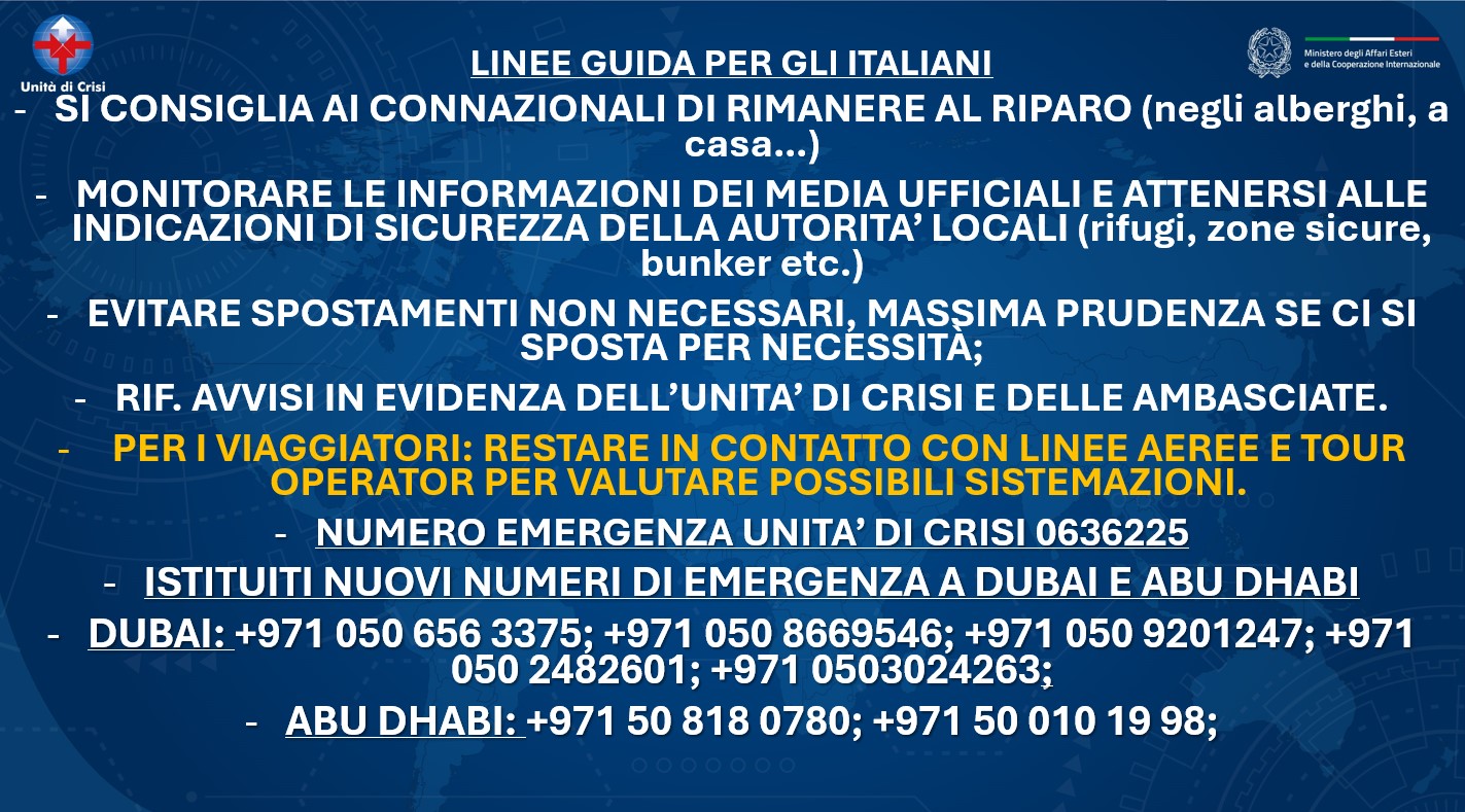 FIAVET conferma di mantenere contatti diretti e continuativi con il Ministero degli Affari Esteri e della Cooperazione Internazionale ed in particolare con l'Unità di Crisi per ricevere aggiornamenti ufficiali e tempestivi sulla situazione di sicurezza, monitorare eventuali modifiche alle indicazioni di viaggio per i cittadini italiani e condividere con rapidità informazioni utili alle agenzie associate, nonché per garantire un raccordo istituzionale costante attraverso i canali diplomatico-consolari competenti.
