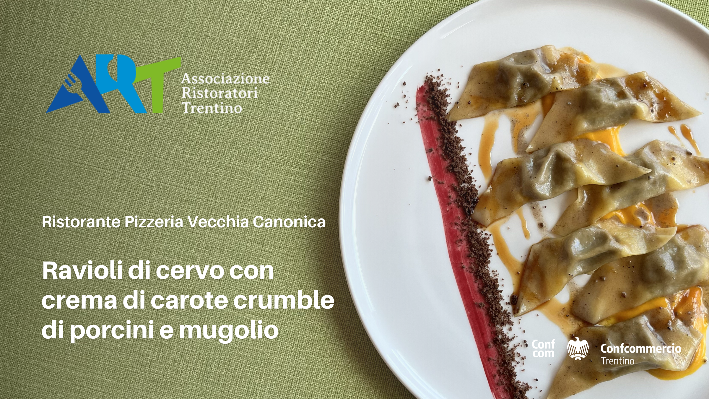 Un piatto che racconta il territorio trentino attraverso sapori intensi e contrasti armoniosi: i ravioli di pasta fresca ripieni di cervo, arricchiti dalle note aromatiche del ginepro, incontrano la dolcezza della crema di carote e la croccantezza del crumble ai porcini. Una proposta raffinata ma profondamente legata alla tradizione del Ristorante Pizzeria Vecchia Canonica di Malè.