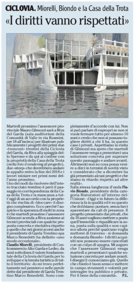 Sul quotidiano L'Adige l'intervista ai presidenti Miorelli e Biondo in vista dell'incontro che ci sarà con l'assessore provinciale Mauro Gilmozzi. Il tratto trentino della ciclovia del Garda va realizzato al più presto e senza indugi. Da sciogliere il "nodo" in corrispondenza della Casa della Trota, l'ex ristorante di proprietà della famiglia Cicciarello che gli stessi desiderano riportare "alla luce" ristrutturandolo. L'idea? Far passare la ciclovia sulla terrazza della stessa è un'ipotesi da vagliare.