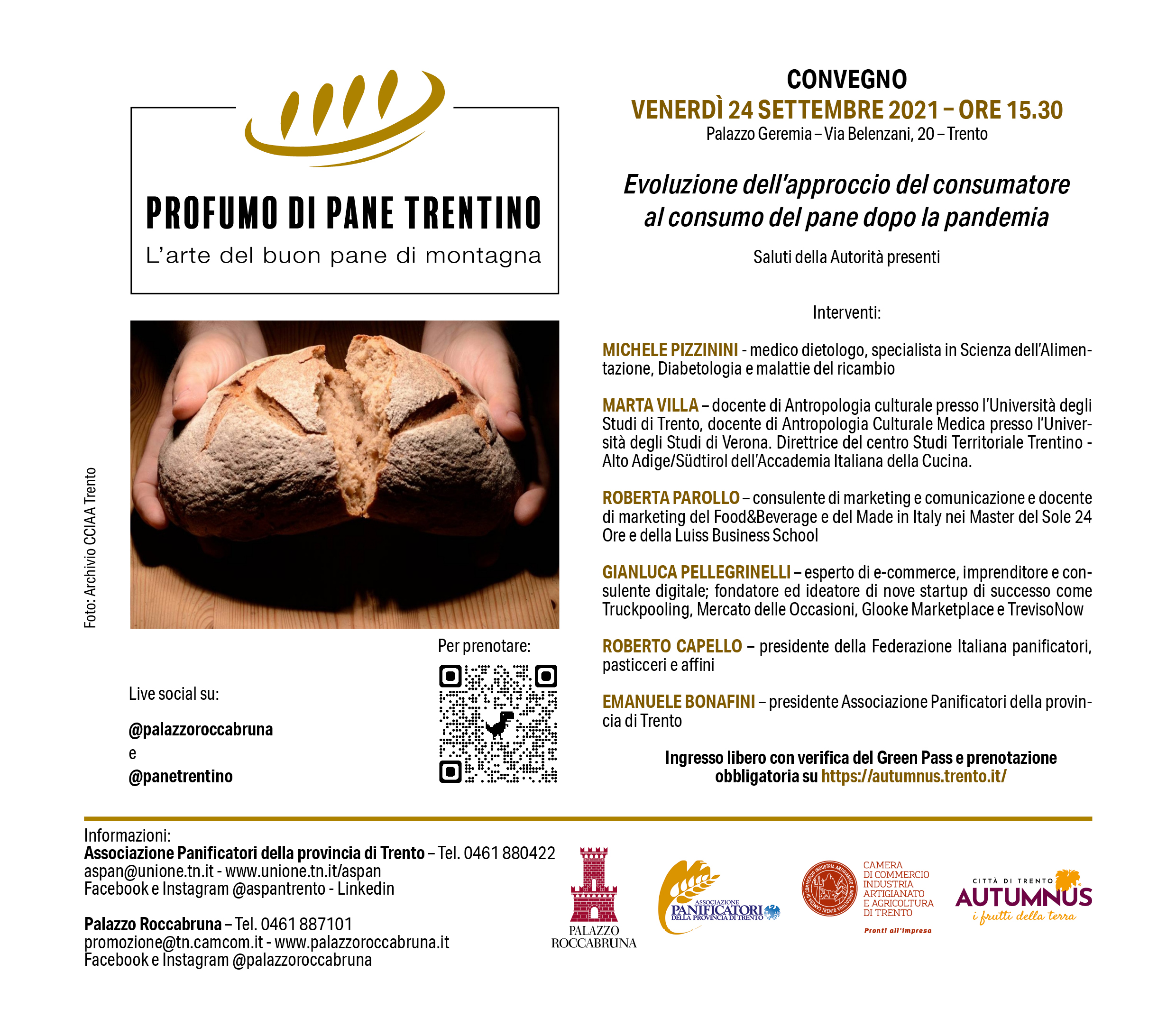 Com’è cambiato il consumo di pane a causa della pandemia da coronavirus? Per cercare di rispondere al quesito, l’Associazione panificatori della provincia di Trento e la Camera di Commercio hanno organizzato, in occasione dell'evento Profumo di Pane Trentino, che quest’anno si svolge all’interno della kermesse Autumnus, un convegno al quale hanno partecipato, oltre ai vertici provinciali e nazionali dell’Aspan, il nutrizionista Michele Pizzinini, l’antropologa Marta Villa, gli esperti di comunicazione e marketing Gianluca Pellegrinelli e Roberta Parollo.