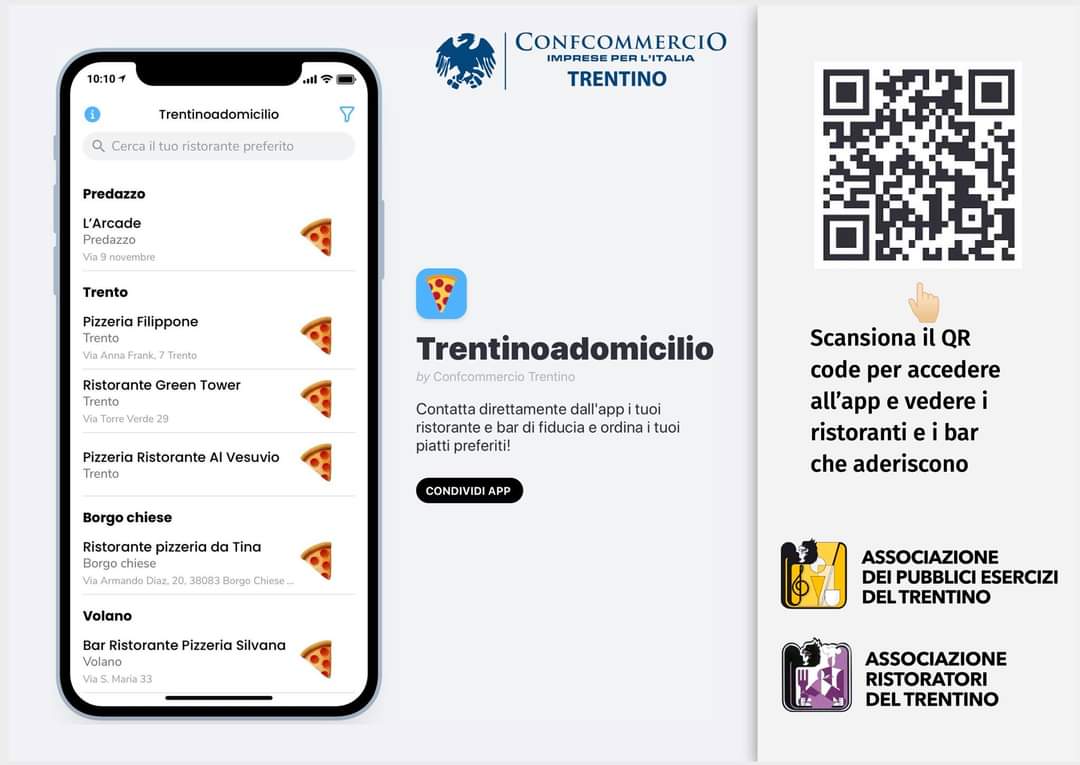 Ti invitiamo pertanto a compilare il form https://forms.gle/DGZmoV9SxZVivCBA8 con tutti i tuoi dati per apparire sull’App “Trentinoadomicilio”. L’App verrà promossa su tutti i nostri canali di comunicazione (sito, pagina facebook, newsletter etc.) per far si che diventi un utile strumento per tutte le persone che vogliono gustare una piatto o una pizza direttamente a casa.