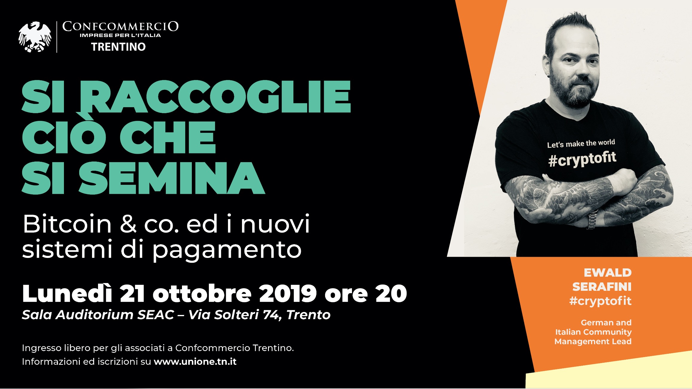 Relatore dell'incontro dal titolo "Si raccoglie ciò che si semina" sarà Ewald Serafini, di #cryptofit, realtà nota a livello internazionale in tema di criptovalute e innovazione.