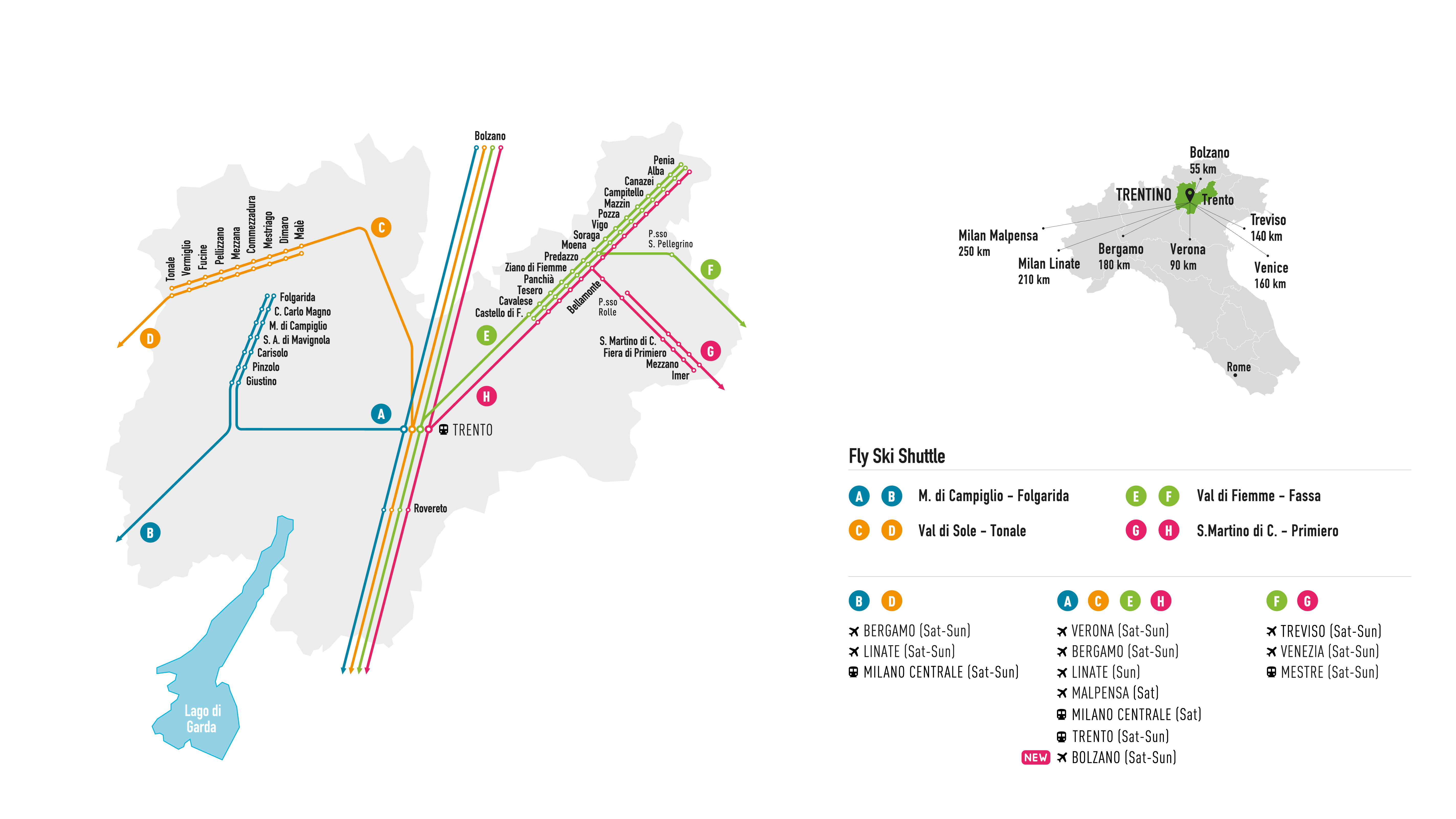 Il servizio collega gli aeroporti di Verona, Bergamo, Venezia, Treviso, Milano Linate e Malpensa, Bolzano e le stazioni ferroviarie di Milano Centrale, Venezia Mestre, Trento con le località di Val di Fassa, Val di Fiemme, San Martino di Castrozza- Passo Rolle - Primiero, Val di Sole - Passo del Tonale, Madonna di Campiglio -Pinzolo - Folgarida.