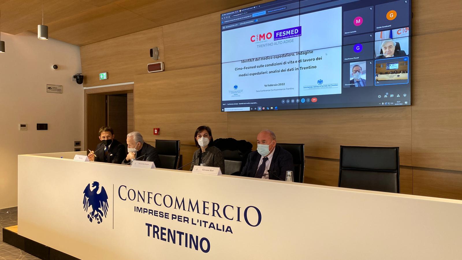 Alla conferenza stampa di questa mattina, moderata dall’avv. Gianpiero Orsino, hanno partecipato la rappresentante dei medici ospedalieri di Cimo Trentino - Alto Adige, dott.ssa Sonia Brugnara, Giovanni Bort, presidente di Confcommercio Trentino, Mario Oss, presidente dell’Associazione Attività di Servizio, Guido Quici, presidente nazionale Cimo, e Marco Ioppi, presidente dell’Ordine dei Medici del Trentino. Ai saluti dei presidenti Bort e Oss, che hanno colto l’occasione per ringraziare la categoria anche per il prezioso lavoro svolto quotidianamente, è seguita l’illustrazione del sondaggio nazionale da parte del dott. Quici.