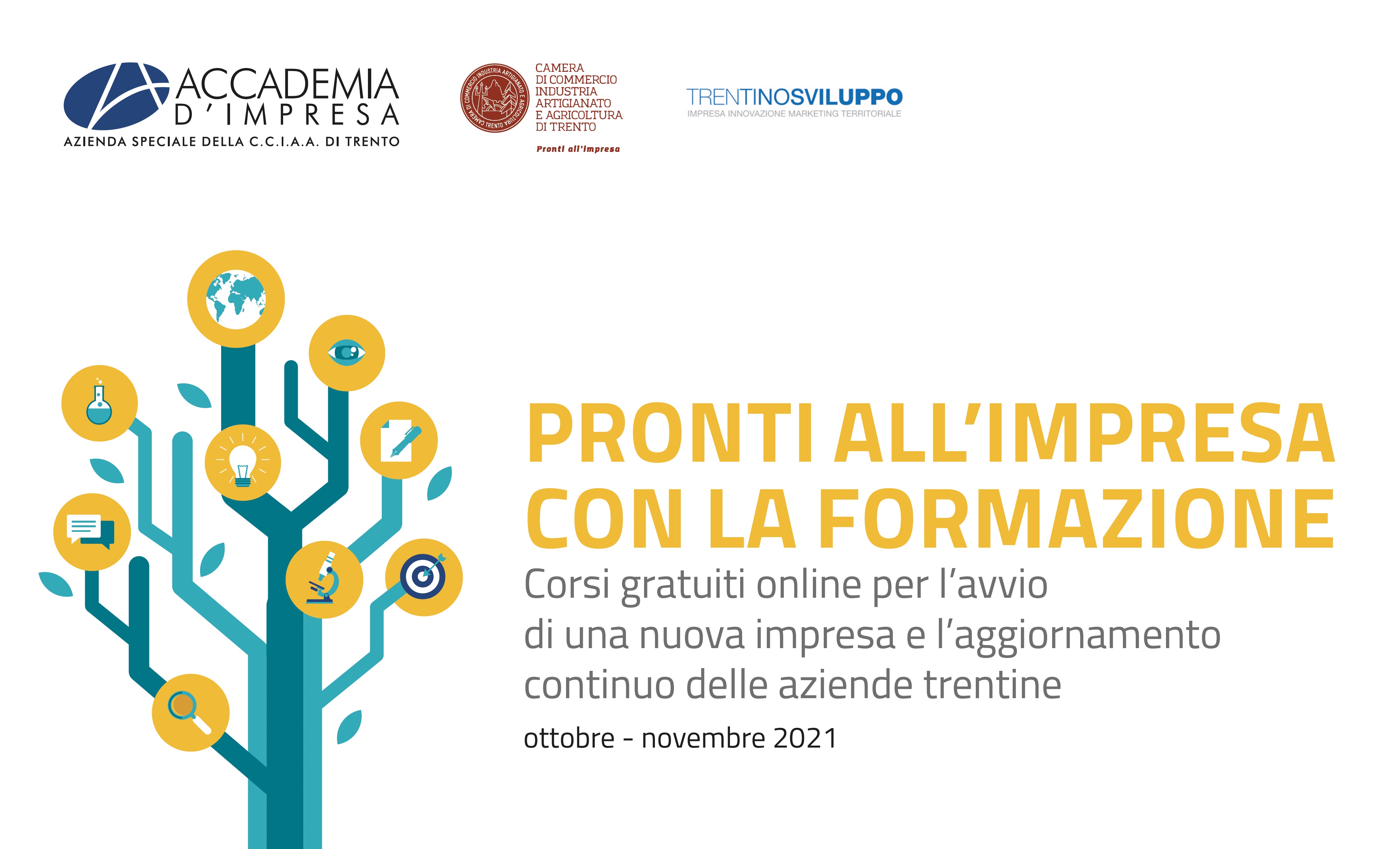 Bruno Degasperi, direttore di Accademia d’Impresa ha illustrato il nuovo servizio: “La proposta formativa, completamente gratuita, è articolato su due livelli, fruibili indipendentemente. Un webinar d’accesso, dal titolo “Nuova impresa”, a carattere divulgativo, che approfondisce il tema degli adempimenti amministrativi collegati con l’apertura di un’azienda, ma anche quello delle opportunità (bandi, contributi, finanziamenti) e dei servizi messi a disposizione dal sistema pubblico provinciale e nazionale. Un secondo livello, più strutturato, dal titolo “Pronti all’impresa con la formazione” - evidente richiamo al payoff della Camera di Commercio di Trento - organizzato in 14 interventi online in diretta, fruibili anche singolarmente e concepiti per fornire un primo approccio a funzioni e competenze basilari di carattere tecnico-gestionale (strategia e innovazione, gestione economico-finanziaria, risorse umane, comunicazione e marketing). Le due iniziative, che saranno proposte periodicamente nel corso dell’anno, sono curate da docenti di Accademia d’Impresa e si rivolgono non solo ad aspiranti e neoimprenditori, ma anche a piccoli imprenditori e loro collaboratori desiderosi di acquisire nuove competenze”.